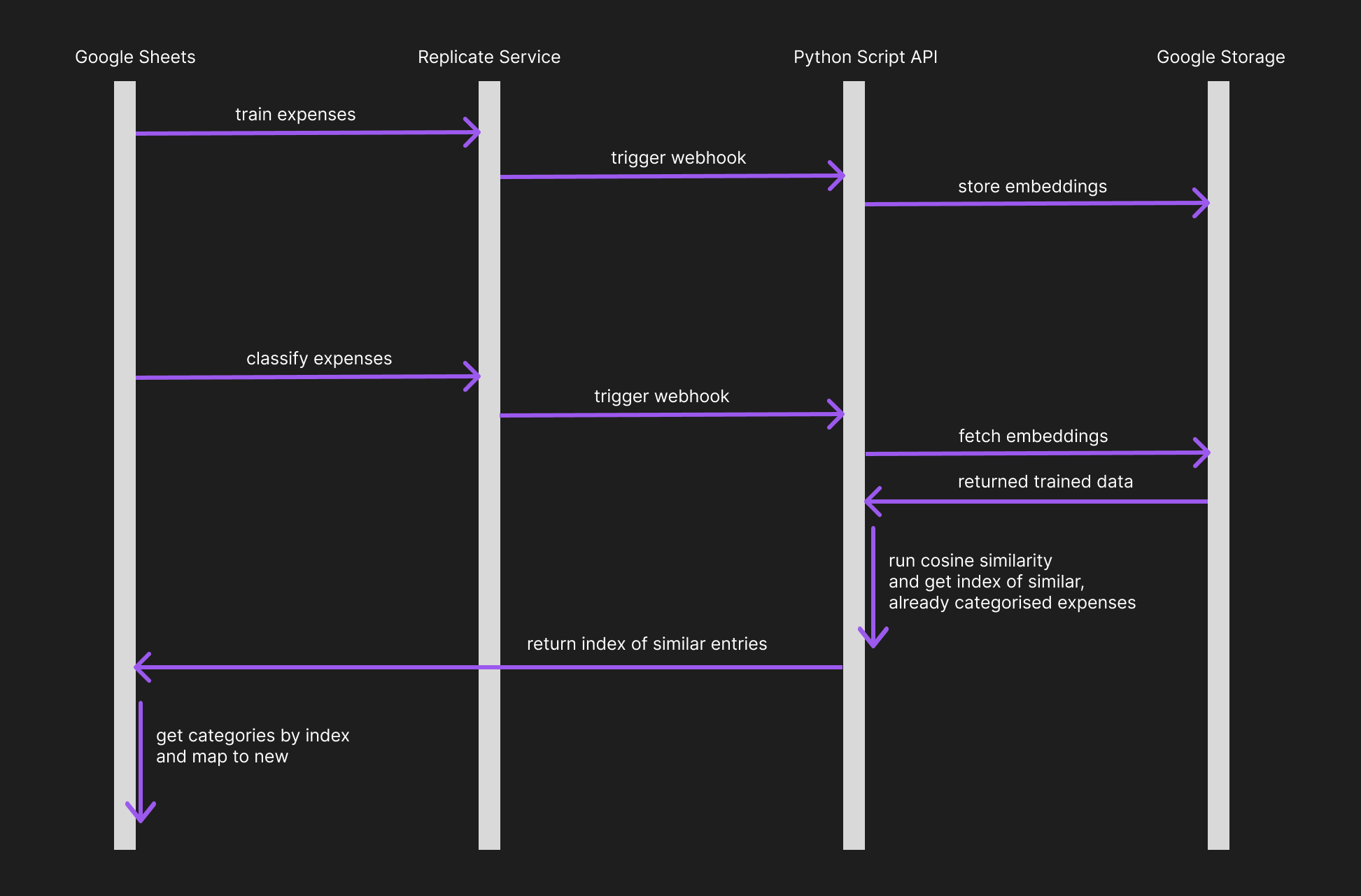 The classifying, where the new expenses are turned into embeddings and the meaning of each is compared with the old expenses stored in the bucket.