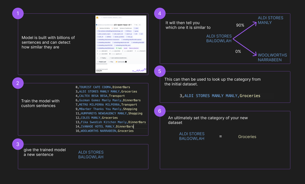 The tricky part is done with a machine learning model. The sentence transformer model. It turns a sentence, such as our expense description, into a numerical format. This is called embedding and allows understanding of the meaning of the sentence.